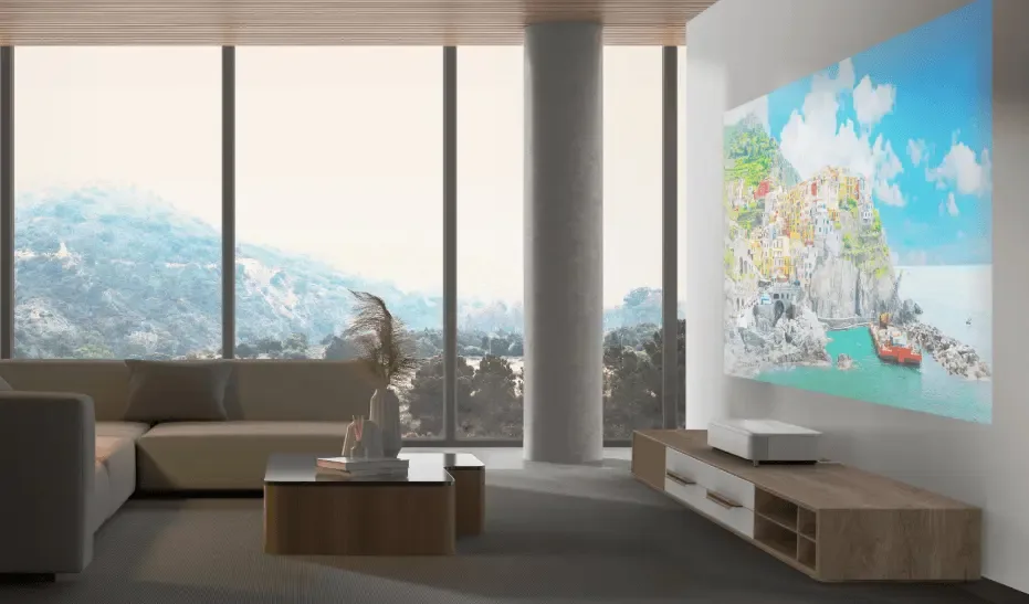 L’ultra-courte focale est l’un des autres atouts majeurs de ce modèle : placé à seulement quelques centimètres du mur ou de l’écran, le projecteur peut produire une image jusqu’à 150 pouces de diagonale. Cela permet d’obtenir une projection massive sans nécessiter de recul important dans la pièce.