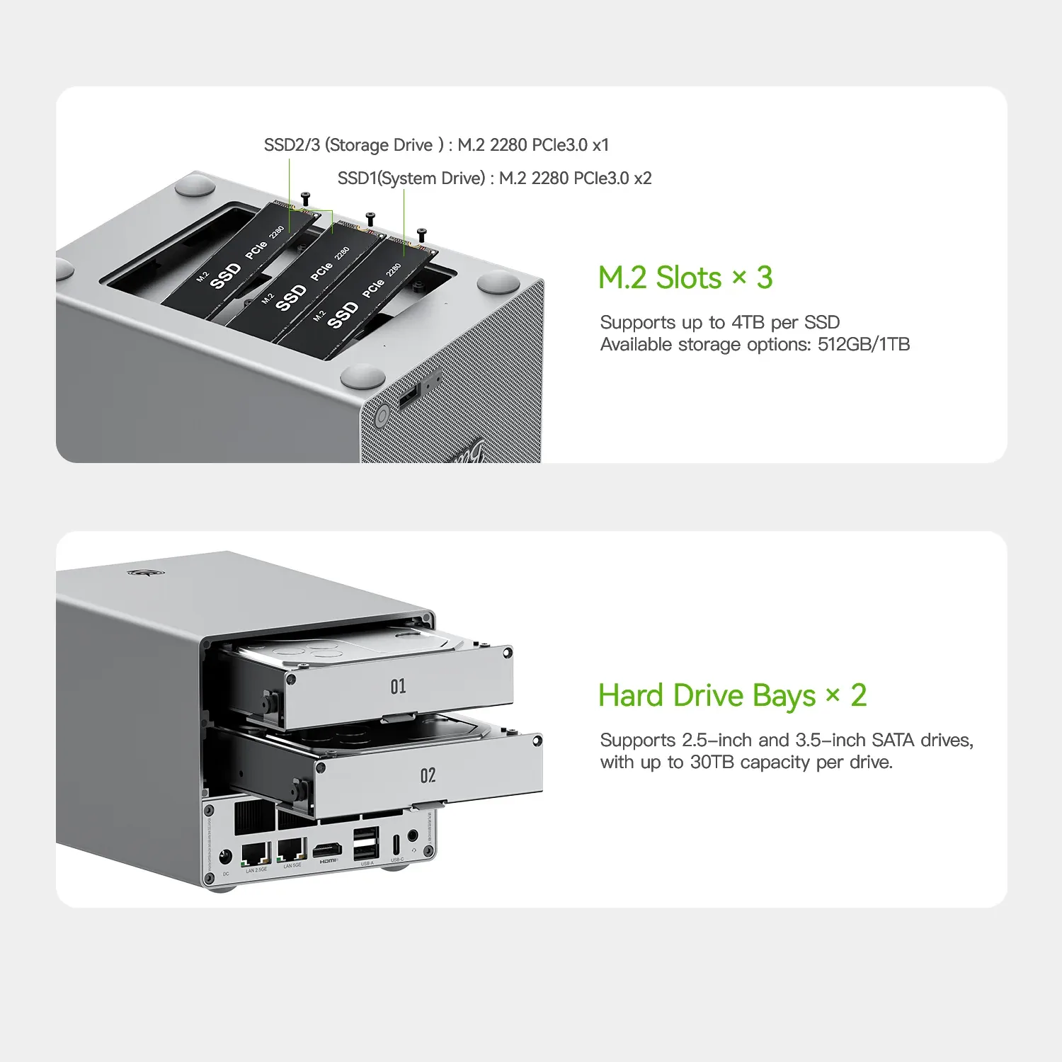 Cette combinaison entre composants mini PC, espace de stockage volumineux et refroidissement efficace positionne le ME Pro comme une solution unique. Il peut fonctionner aussi bien comme serveur de fichiers domestique, plateforme de sauvegardes ou serveur multimédia que comme PC compact traditionnel.